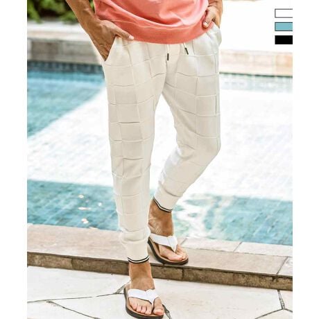 編み込んだような立体的なブロックデザインがクラス感を漂わせる、オリジナルテキスタイルで仕立てたニットパンツ。