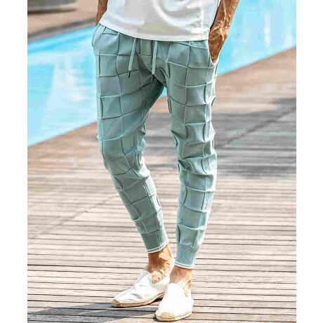 編み込んだような立体的なブロックデザインがクラス感を漂わせる、オリジナルテキスタイルで仕立てたニットパンツ。