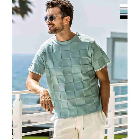 編み込んだような立体的なブロックデザインがクラス感を漂わせる、オリジナルテキスタイルで仕立てたカットソー。