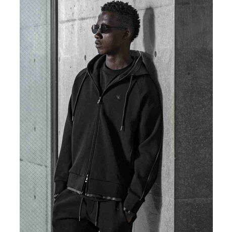 フード、袖・裾口にレザーを差し込んだジップフーディー。