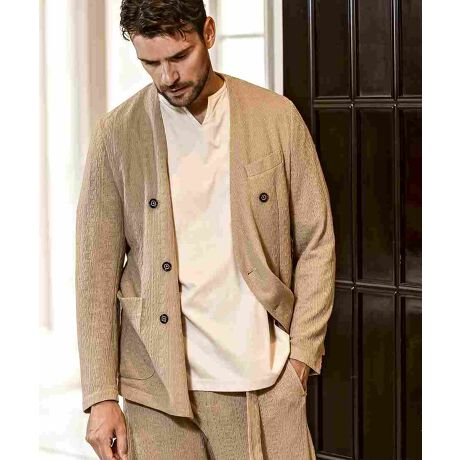落ち感のある麻混素材をジャガード編みで表情豊かに仕上げたダブルジャケット。