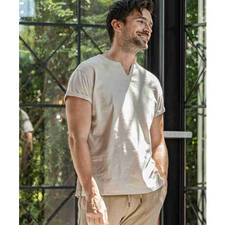 麻混素材ならではのドライな質感により、汗ばむ季節でも肌離れが良く、ノンストレスで軽快な着心地を実現しています。