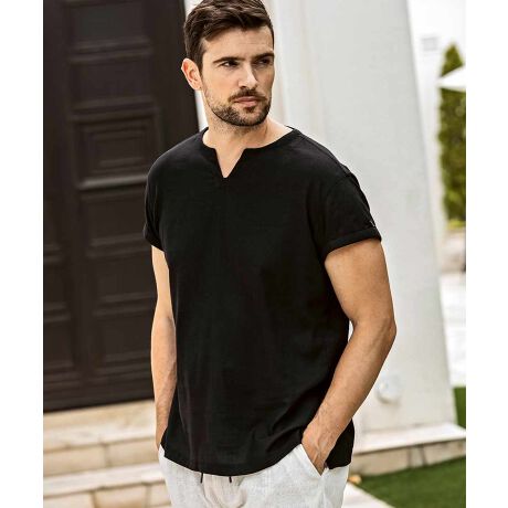 リラックス感と大人の上品さを兼ね備えたキーネックデザインの半袖カットソー。