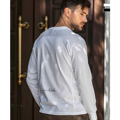 背面にラインストーンロゴを配置した長袖カットソー。