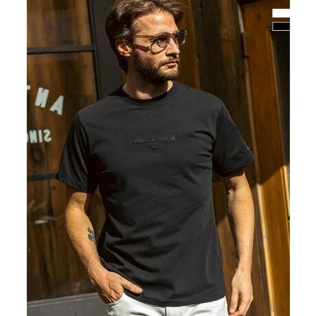 胸元にブランドロゴをエンボスで配置した半袖Tシャツ。