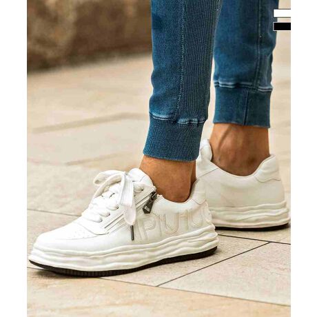 波打つような個性的なアウトソールが目を引くロゴスニーカー。