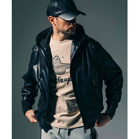マークゴンザレスのアートワークをアップリケで散りばめたフェイクレザージャケット。