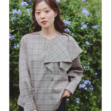 アシンメトリーなケープ風の大きめフリルデザインで大人可愛いブラウス。