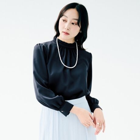 上品な光沢と落ち感のある素材のブラウスには、ハイネックにフリルディテールとギャザーを施しました。