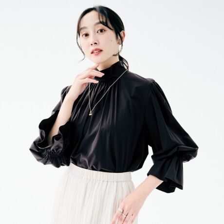 取り外しのボウタイが付いたブラウスは、身頃と袖にたっぷりとギャザーを施したデザイン。