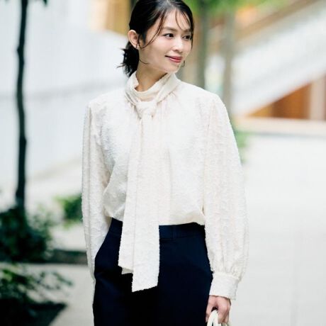 カットジャカード素材に取り外しのボウタイが付いたブラウス。