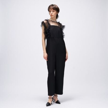 ・ボレロのフリルディテールが女性らしさを引き立て、サロペット単体でも上品で大人なフォーマルスタイルが完成。