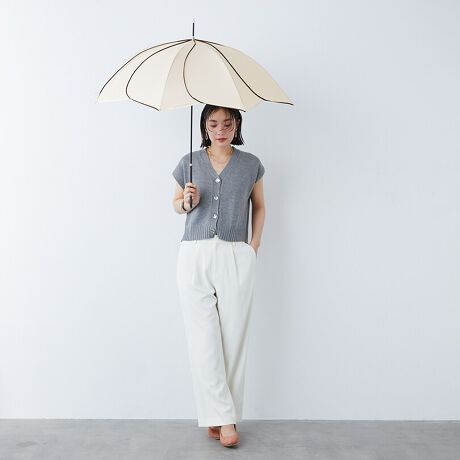 ○傘生地には防水撥水加工を施し、縫製には撥水糸を使用していますが、激しい雨や長時間のご使用では雨が染み込むことがございます。また飾り加工部分(刺繍、ステッチ、パイピング、テープ等)はデザインの特性上、完全な防水撥水加工が難しい場合があり雨が染みやすいのでご注意下さい。