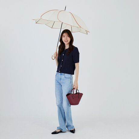 ○傘生地には防水撥水加工を施し、縫製には撥水糸を使用していますが、激しい雨や長時間のご使用では雨が染み込むことがございます。また飾り加工部分(刺繍、ステッチ、パイピング、テープ等)はデザインの特性上、完全な防水撥水加工が難しい場合があり雨が染みやすいのでご注意下さい。