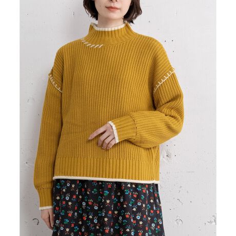 ざっくりとした編み目と、ゆったり着られるラグランスリーブが魅力の、毎日着たくなるベーシックニット。首元まで暖かいハイネックで、配色デザインがさりげないアクセントに。ハンドステッチ刺繍がポイントです。柄ボトムやカラーパンツなど、ちょっと遊び心のあるアイテムとも相性抜群!