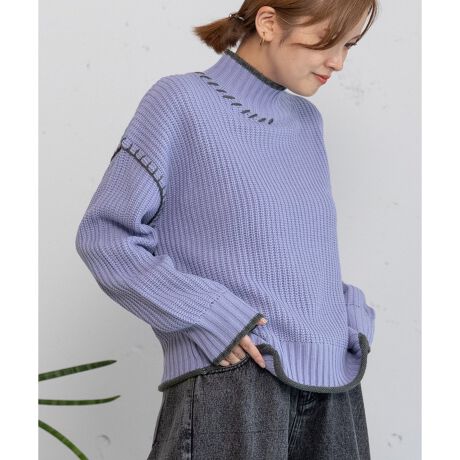 ざっくりとした編み目と、ゆったり着られるラグランスリーブが魅力の、毎日着たくなるベーシックニット。首元まで暖かいハイネックで、配色デザインがさりげないアクセントに。ハンドステッチ刺繍がポイントです。柄ボトムやカラーパンツなど、ちょっと遊び心のあるアイテムとも相性抜群!