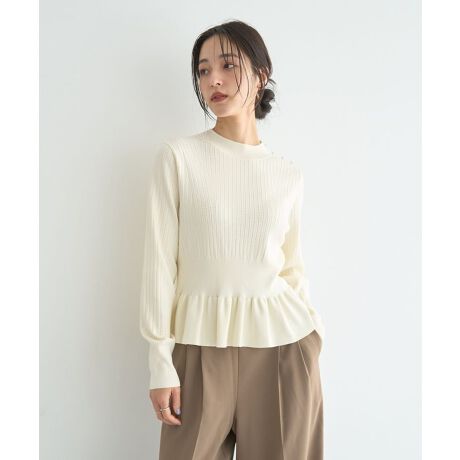 片側のショルダーに並べた金ボタンが華やかなニットプルオーバー。