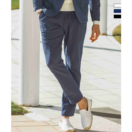ストレッチ性と通気性に優れたシアサッカー素材を使用したテーパードスラックス。