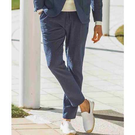 ストレッチ性と通気性に優れたシアサッカー素材を使用したテーパードスラックス。
