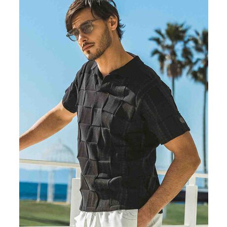 編み込んだような立体的なブロックデザインがクラス感を漂わせる、オリジナルテキスタイルで仕立てたスキッパーシャツ。