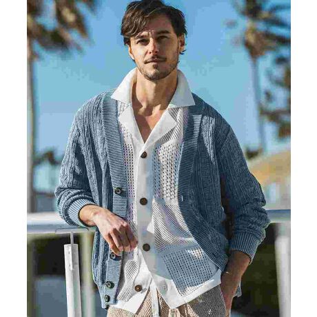 クラシックなショールカラーデザインを、爽やかなインディゴトーンのジャガードニットで仕上げたカーディガン。