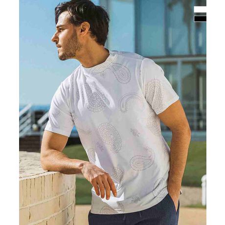 オリジナルのペイズリー柄がリゾートライクなモックネックTシャツ。