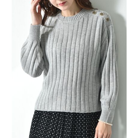 ニット特有のチクチク感もなく、やわらかい肌触りで着心地が良いのがポイントです。控えめなクルーネックは顔回りをきれいに見せてくれ、肩ボタンでアクセントをプラスしました。