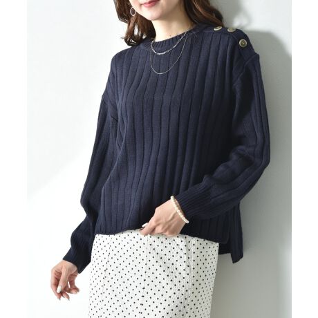 ニット特有のチクチク感もなく、やわらかい肌触りで着心地が良いのがポイントです。控えめなクルーネックは顔回りをきれいに見せてくれ、肩ボタンでアクセントをプラスしました。