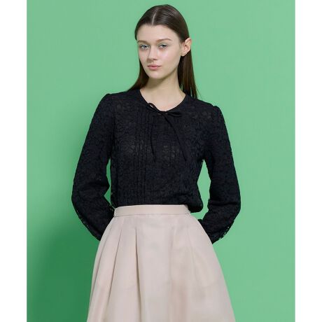 繊細なレース素材を全面に使用した、華やかで上品なブラウス。フロントにはタックを施し、立体感のある表情をプラスしました。首元には細めのリボンをあしらい、クラシカルな中にも可憐なアクセントを添えました。レースの透け感が女性らしい柔らかさを引き立てつつ、長袖デザインで落ち着きのある印象に。ジャケットやカーディガンのインナーとしても映え、きちんと感を求めるシーンにも最適。フェミニンにもシックにもスタイリングできる万能な一枚で、オフィスから特別なシーンまで幅広く活躍してくれます。