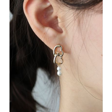 ハートモチーフが連なったメタルチェーンにパールをあしらった、上品なかわいさのピアス。