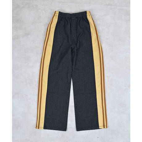 デニムパンツにトラックパンツ風のサイドライン切り替えをプラスした、リメイク感のある1本です。