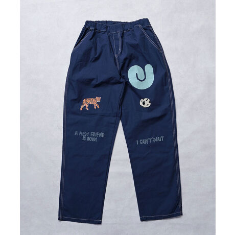 目を引くプリントがポイントのツイルパンツ。