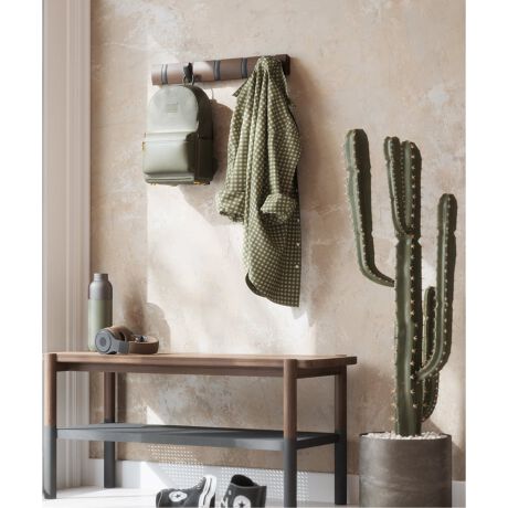 壁に取り付けて、金具の部分を手前に倒すと、フックが出現。使わない時は戻しておけば、ポール状にすっきりと一本になり、壁になじんでインテリアを邪魔しません。