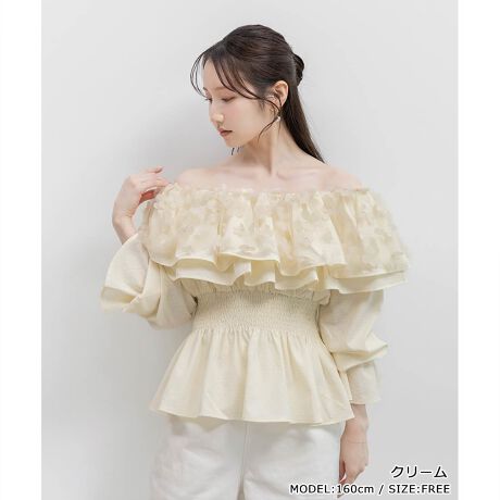 立体的なフラワーチュールを重ねた繊細なケープカラーがドラマティックなブラウス。