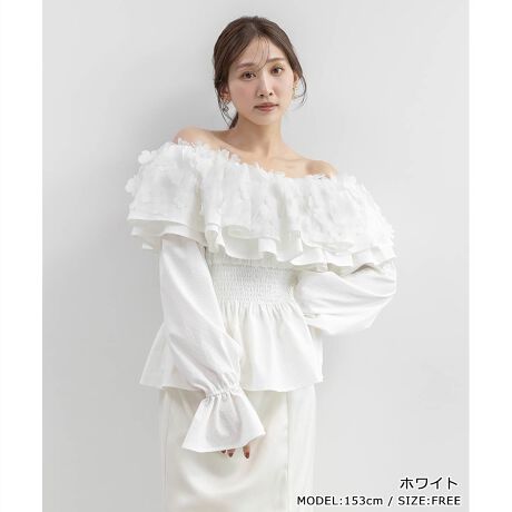 立体的なフラワーチュールを重ねた繊細なケープカラーがドラマティックなブラウス。