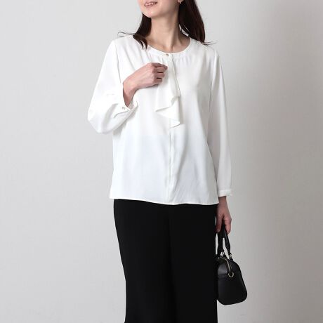 ネックラインはきちんと感とデコルテをキレイに見せるスッキリとした切替えラウンドネックです。