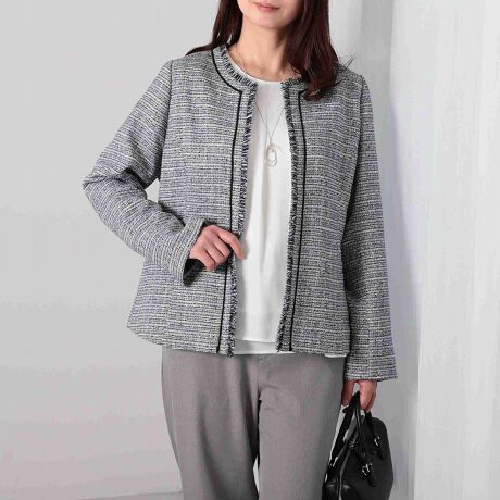 エレガントなファンシーツイードのノーカラージャケット。