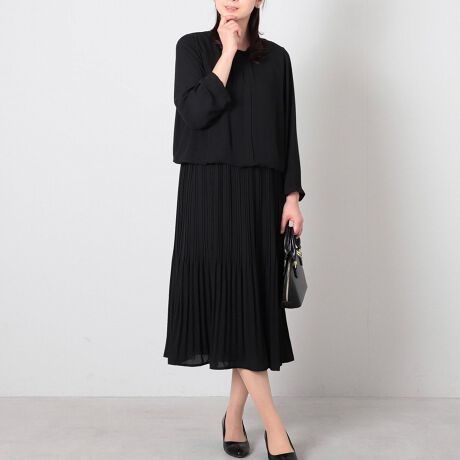 フロントタックがクラシカルで女性らしい印象の上身頃にプリーツスカートを合わせた1枚。