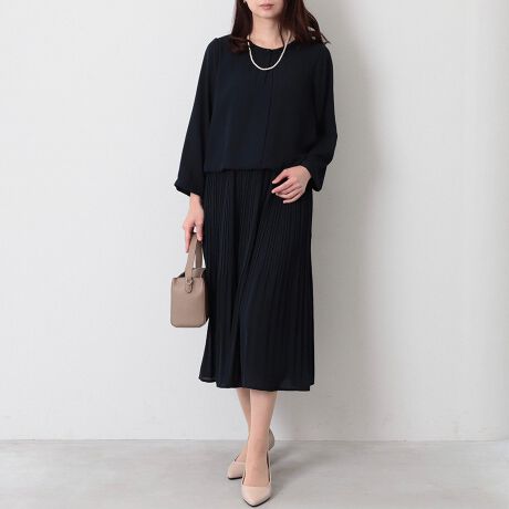 フロントタックがクラシカルで女性らしい印象の上身頃にプリーツスカートを合わせた1枚。