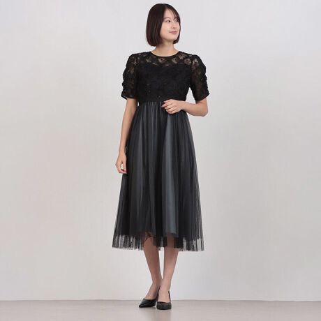 レース×チュールのクラシックな華やかパーティードレス。