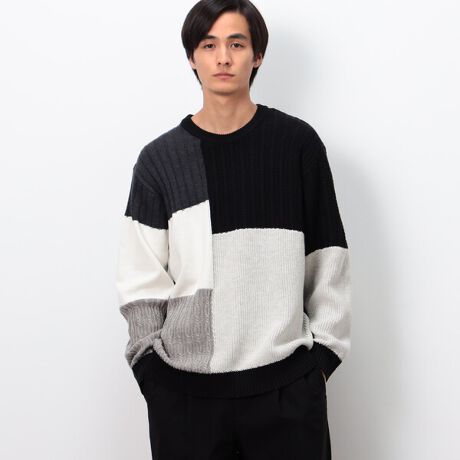 身頃に4色の色を使い、それぞれ編地を変えてパッチワーク風のデザインに仕上げたこだわりのデザインです。
