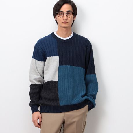 身頃に4色の色を使い、それぞれ編地を変えてパッチワーク風のデザインに仕上げたこだわりのデザインです。