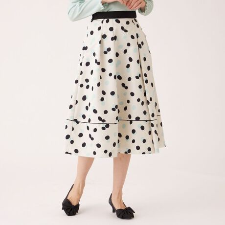裾を切り替え、黒のパイピングコードを挟み込むことでデザインのポイントにしています。タックはインタックにすることで、適度にボリュームを抑えつつ華やかなシルエットを表現。ウエストはグログラン仕様で内側にゴムを入れ、ストレッチ性を持たせてトップスをインしやすいデザインに仕上げています。