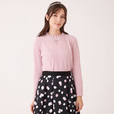 シンプルなデザインにフリルハイネックを組み合わせ、襟元にビジュー刺繍を施した、着回しのきくエレガンスカジュアルなインナーに仕上げました。裏側に透明糸をプレーティングすることで、モール糸特有のダレ感を抑え、よりエレガントな表面感に仕上げました。