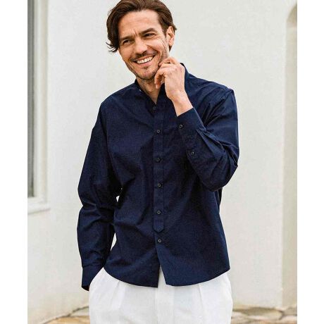 上品さと抜け感を兼ね備えるバンドカラーシャツ。