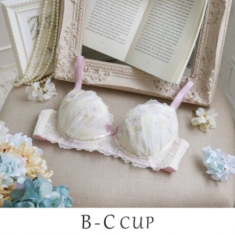 きらめくマーガレットのお花をモチーフにしたシリーズです。カップレースから土台部分には、線で描いたようなステッチでマーガレットや草花を刺繍して、キラキラとほのかに輝くラメ糸が、素朴な可愛らしさを演出。ポイントで温かみのあるウーリー糸をあしらうことで、やわらかくフェミニンな印象に仕上がりました。カップレースにはお花のアップリケを重ねて、さりげない立体感を表現しています。日常にそっと寄り添ってくれるような、小さなときめきを詰め込んだコレクションです。