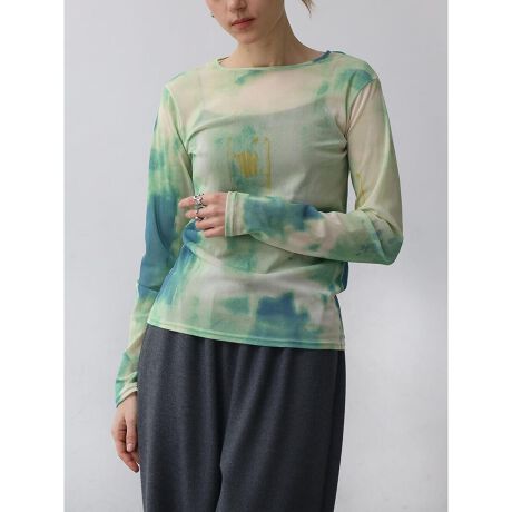 ■デザインAgaオリジナルプリントを転写したニュアンス柄がトレンドライクなトップス。大人の方にも楽しんでいただきやすいシアー感。身体にフィットするコンパクトなシルエットながらも、程よい伸縮性が窮屈感のない着用感。レイヤードスタイルなどアクセントとして着用しても映える着回し力抜群の一着です。