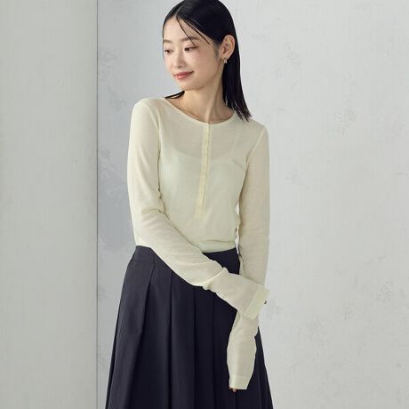 素肌がほんのり透ける、シアーな透明感が印象的なヘンリーネックカットソーです。
