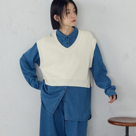 カットソーやシャツに重ねてレイヤードを楽しめるニットベスト。