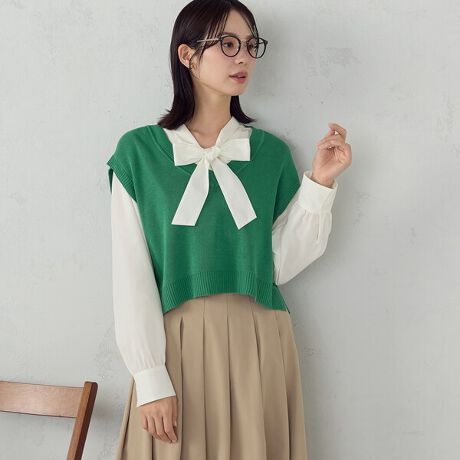 カットソーやシャツに重ねてレイヤードを楽しめるニットベスト。